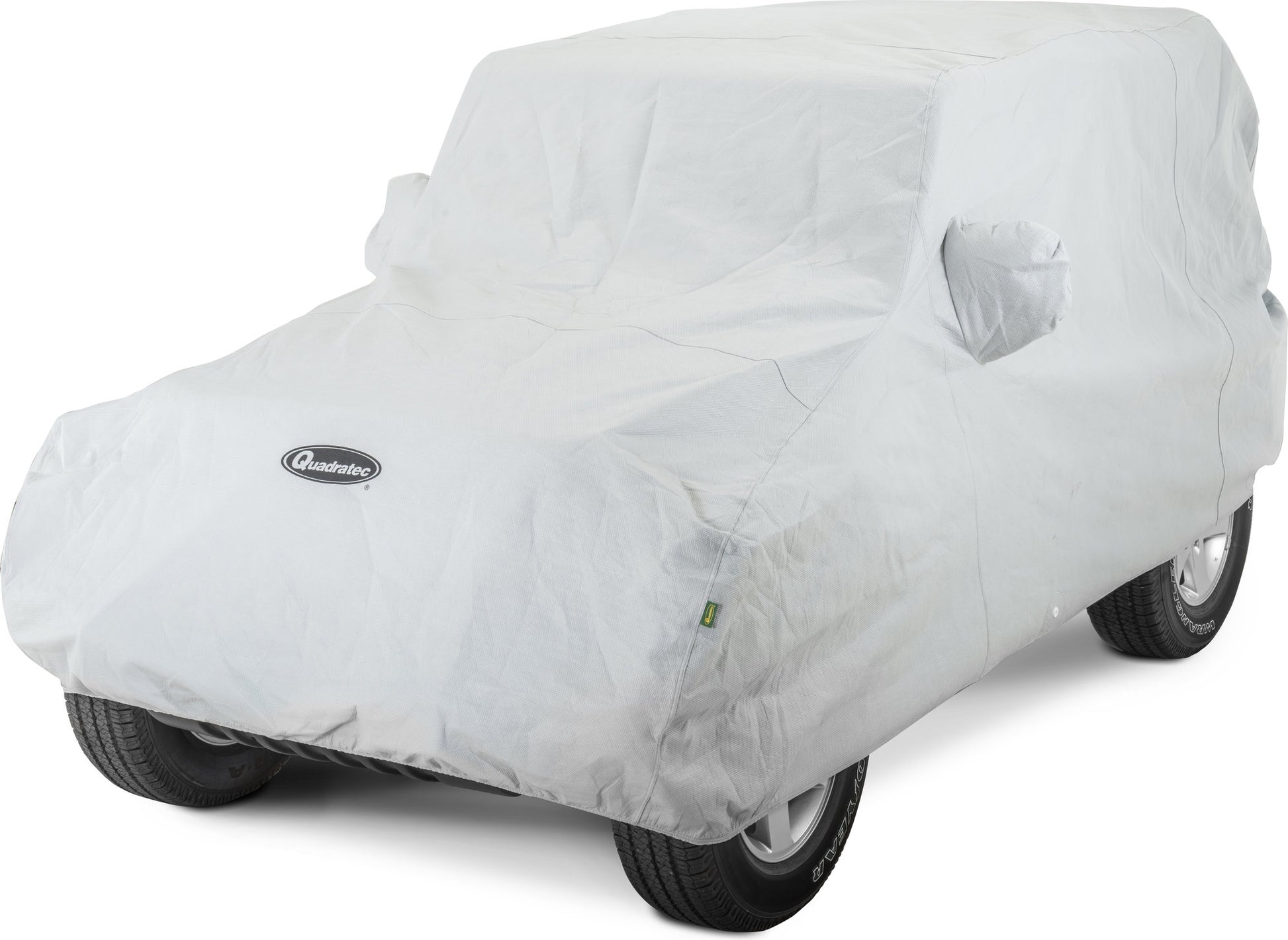 Quadratec's 3 Layer Softbond covers combine strength, breathability and water-resistant protection with exceptional value. Engineered to keep out liquid moisture without trapping condensation while providing excellent protection from tree sap, insects and weather. Quadratec's 3 Layer Softbond Covers feature top and bottom layers of soft non-woven polypropylene with a middle layer of water resistant film. The paint friendly plastic grommets and nylon cinch cords provide added security for longer term coverage in windy conditions. Front and rear hems have elastic material for a snug fit. The custom tailored patterns and oversized mirror pockets provide an excellent fit that also easy to install and remove. Protect your vehicle from rain, snow, dew, fog and sun, with the added protection from door dings, scratches and nicks. The embossed quick drying, breathable fabric wicks moisture away from the vehicle while allowing air to circulate from both sides. Softbond Covers include a drawstring storage bag and a 90” vinyl coated steel cable with anti-theft brass padlock. The included grommet kit provides a do-it-yourself radio antenna provision. Three year limited warranty.